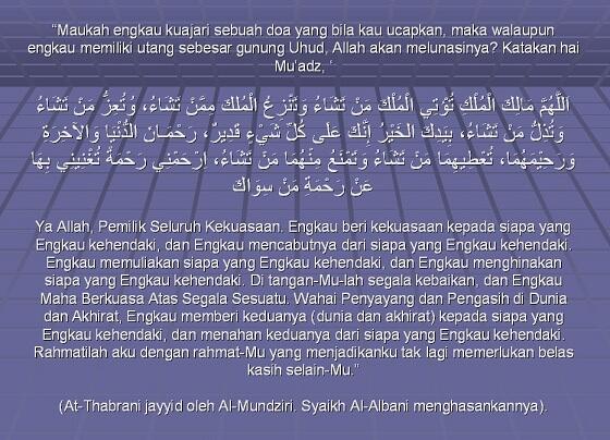 Doa menjadi salah satu cara nabi muhammad saw membantu seseorang yang terjerat dari hutang doa pelunas hutang. Kalau kamu amalkan itu, dan kamu memiliki utang sebesar gunung, allah akan melunasinya.